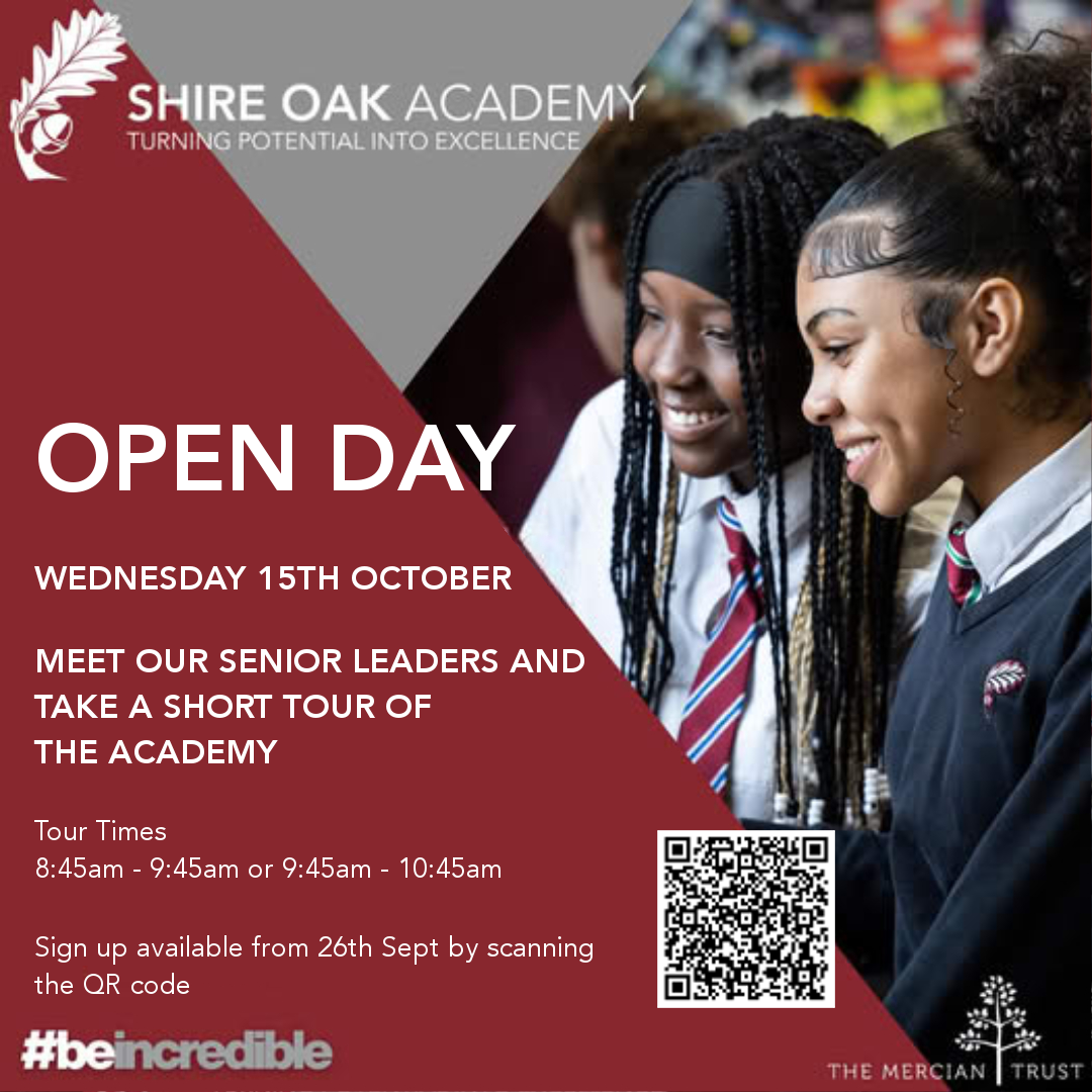 Shire Oak Academy is an exciting and vibrant learning community where students enjoy great success in and outside of the classroom. We aim to provide an outstanding, positive learning environment and value the high quality of relationships that enable this to be true of all aspects of school life. Our Academy motto, ‘Turning Potential into Excellence’ is important to us as we prepare our students for successful adult lives in an increasingly competitive world. We support and encourage our students to try their best to achieve success in all areas and help prepare them for their future choices, not only in their academic learning, but also within other areas such as music, sport, art and drama.